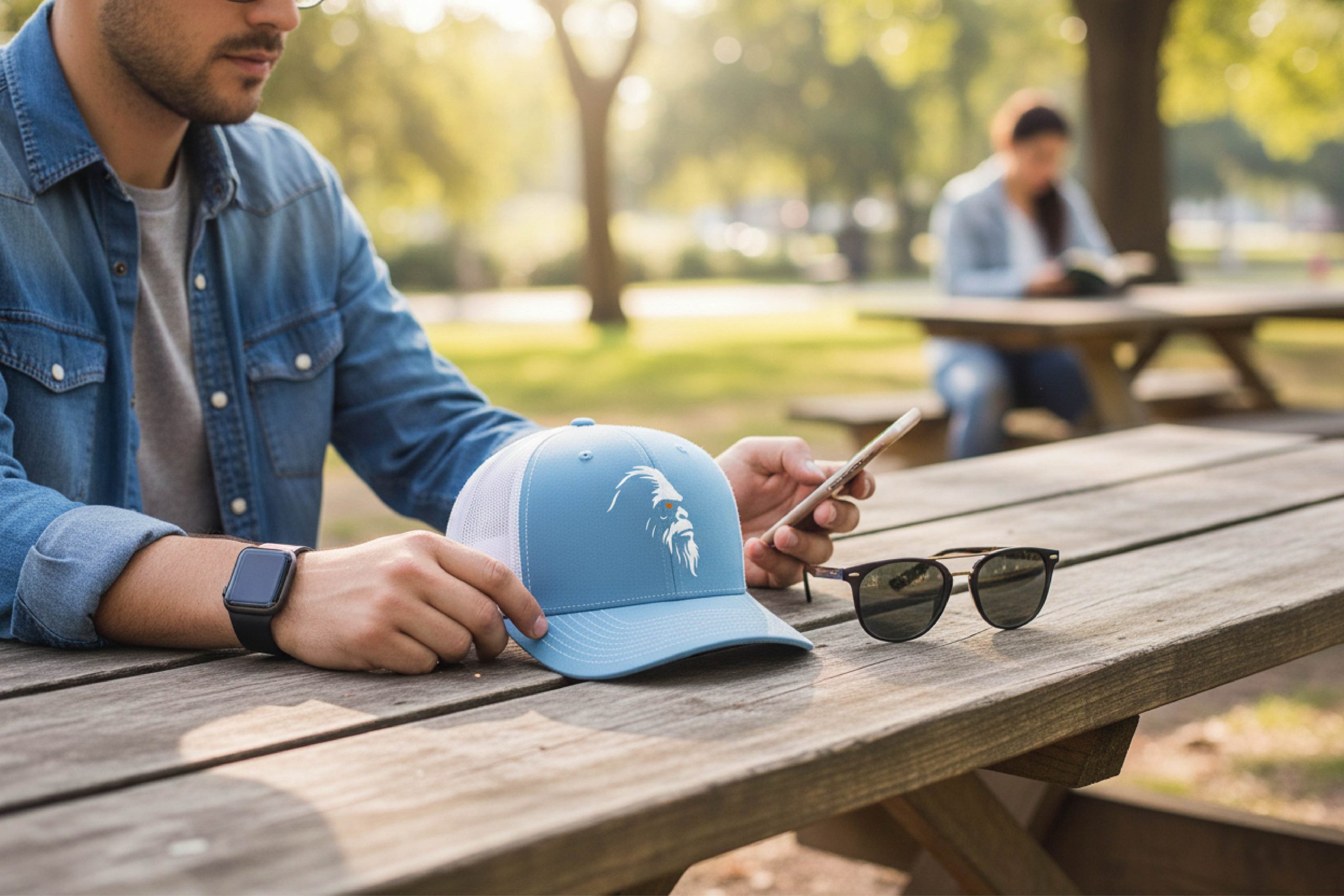 Premium Trucker Hat 112/115 Series Lt Blue White Logo